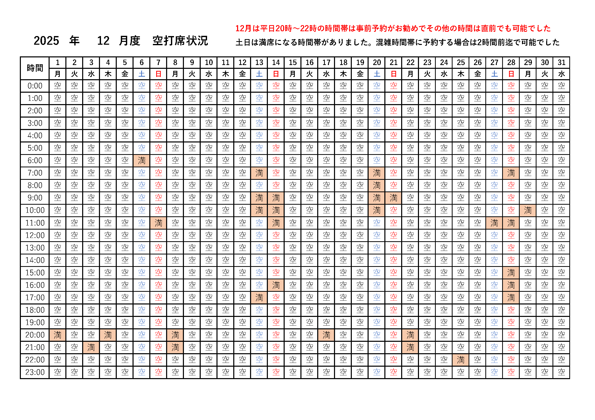 ①予約が取り難くならない様に対応しております。満席状況をこちらで公開しておりますので通いたい時間帯や曜日をご確認ください。